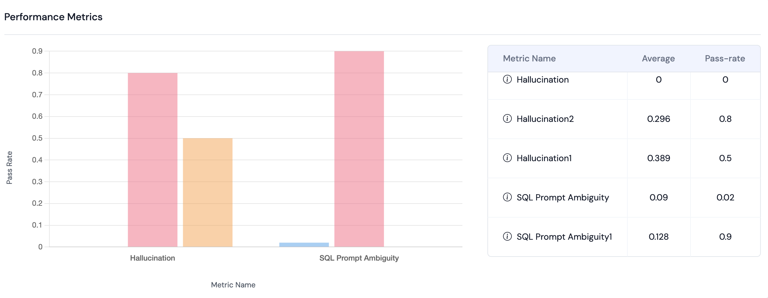 * Shows the **average score** and the **pass rate** (percentage of data points that passed the metric threshold).