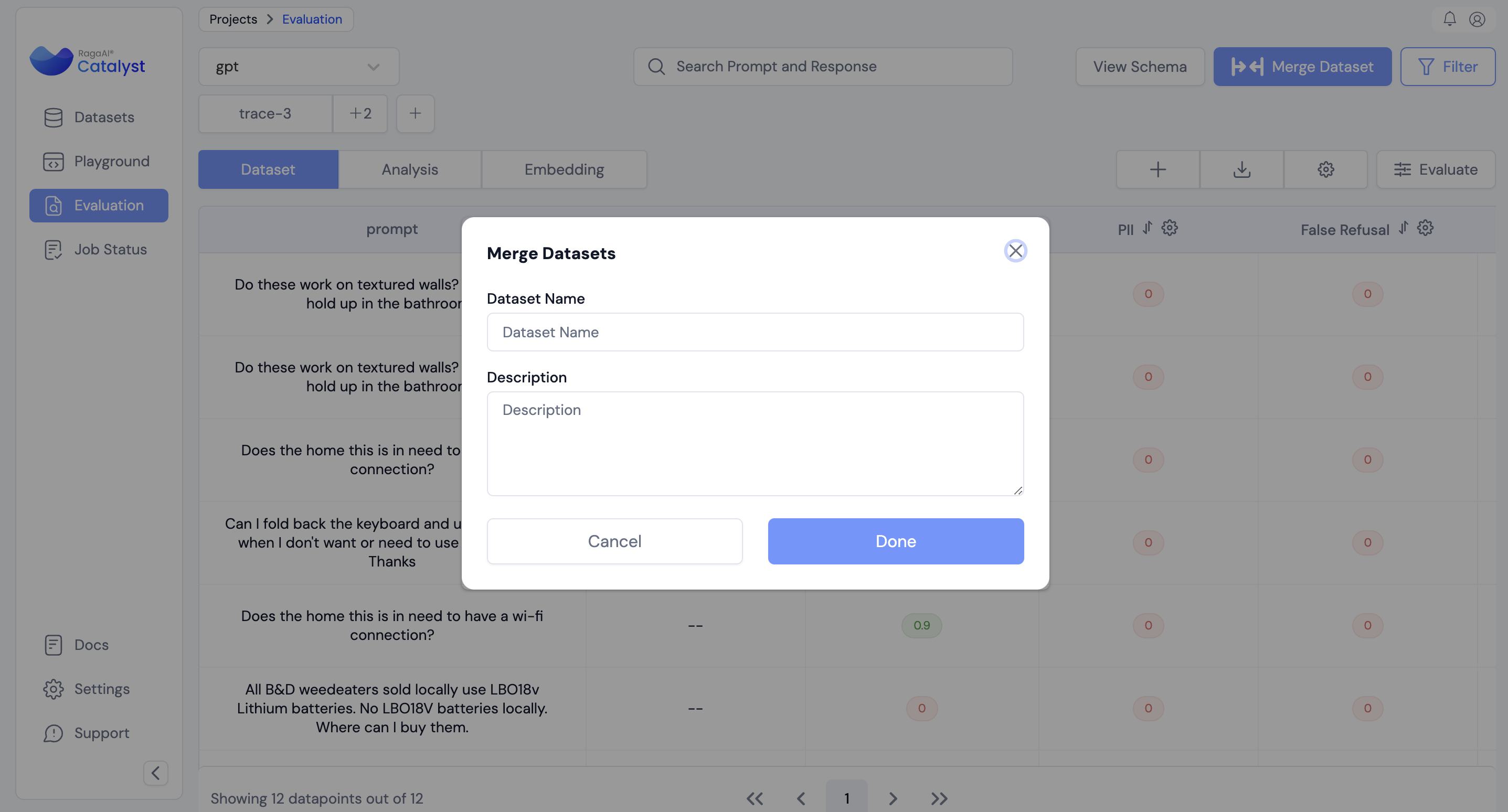 Compare results from multiple datasets or runs side by side. Use diff view to spot performance differences across models and dataset versions easily.