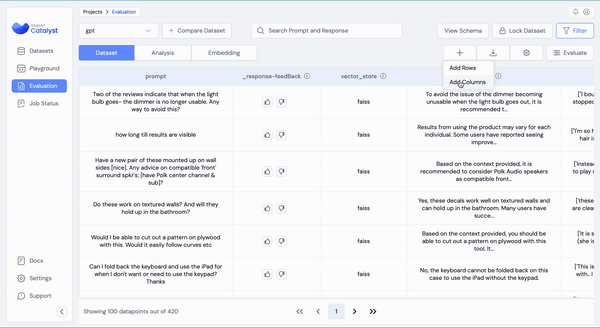 The **Add Datasets** feature in RagaAI Catalyst provides users with two ways to extend their existing datasets: by adding new rows or adding new columns. This allows users to either append additional data or introduce new response columns based on prompts. The workflow adapts based on the dataset's original upload method (CSV or traces).