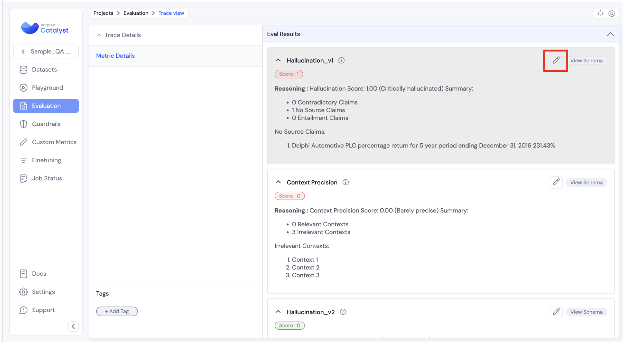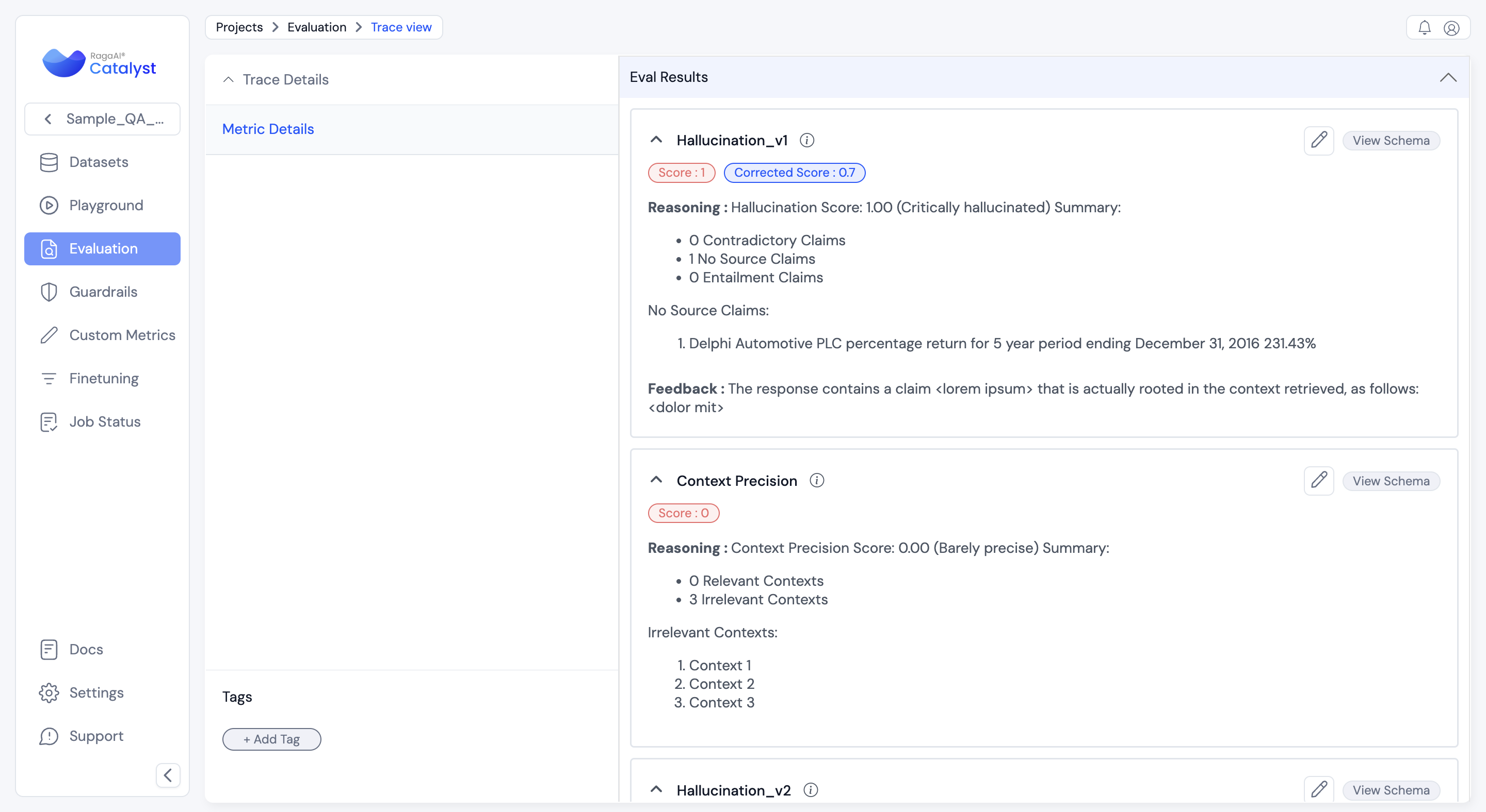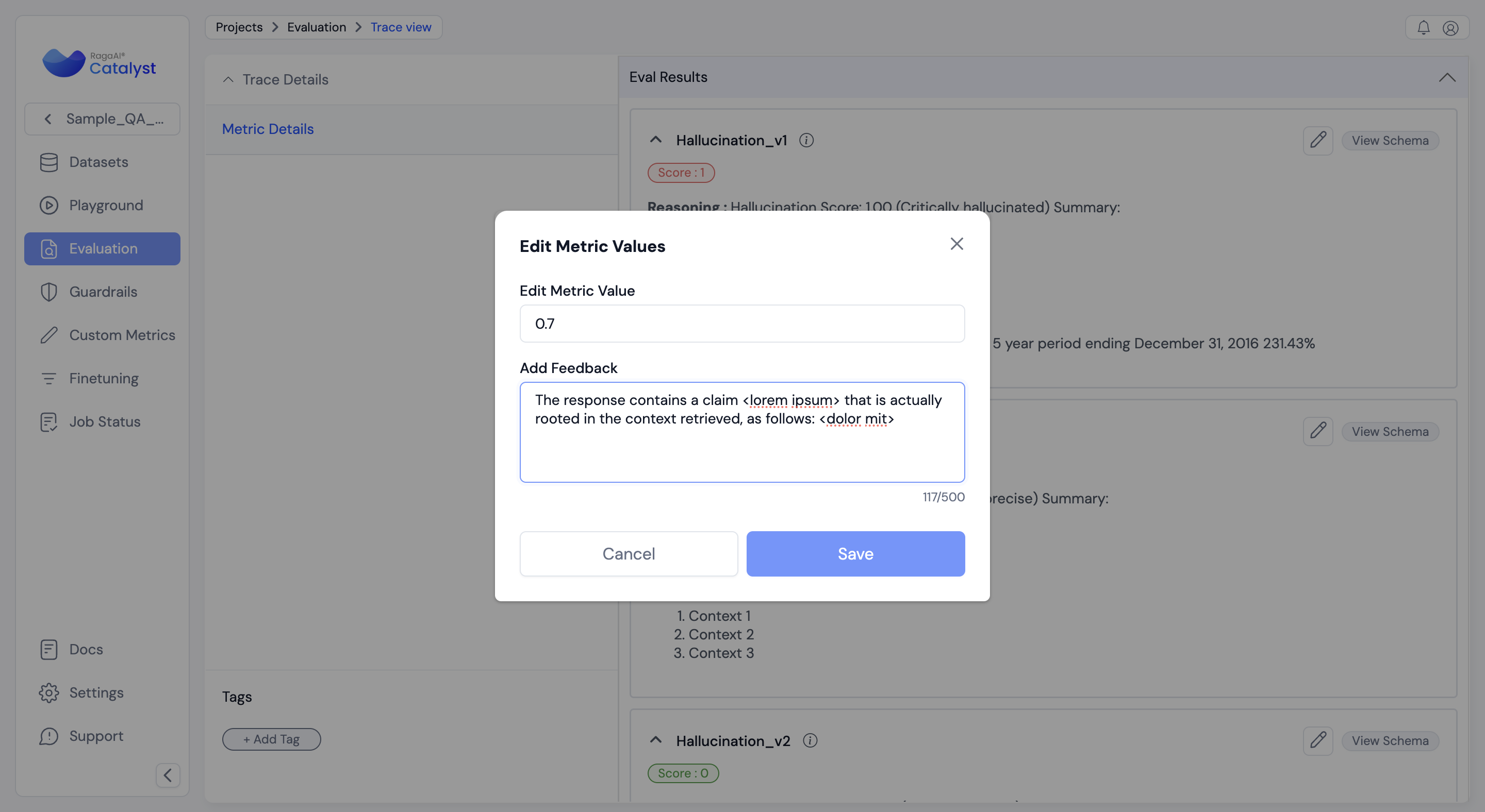 * **Purpose:** Enable users to adjust and improve automated metric scores (e.g., hallucination, context relevance) by providing human insights.