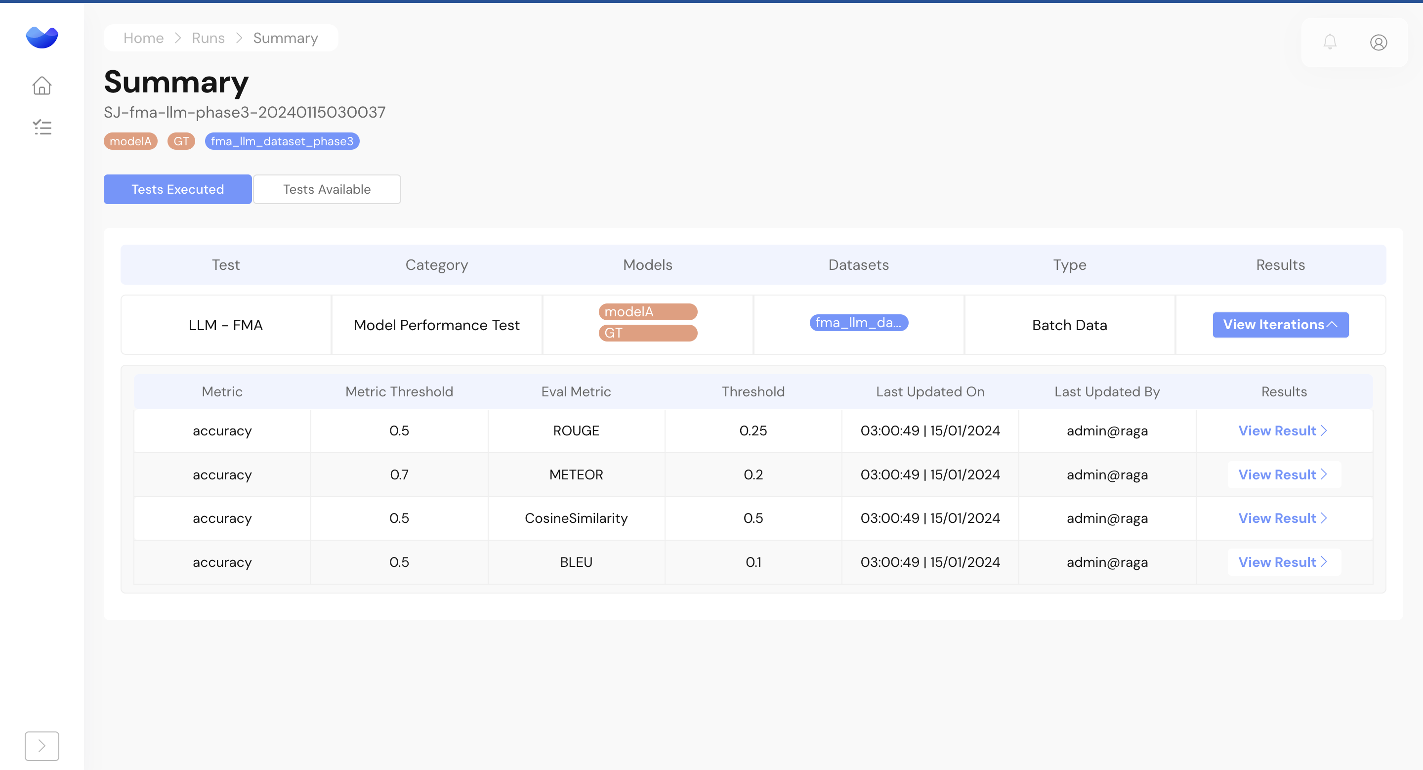 <figure><img src="https://1811327582-files.gitbook.io/~/files/v0/b/gitbook-x-prod.appspot.com/o/spaces%2FYbIiNdp1QbG4avl7VShw%2Fuploads%2FHk6Y0HoF0Q0DyBImIFNe%2FScreenshot%202024-01-16%20at%202.47.48%20PM.png?alt=media&#x26;token=05fba590-ffe7-4019-b2b2-383215792b2b" alt=""><figcaption><p>A summary view of the test runs for LLM Summarisation on RagaAI Testing Platform</p></figcaption></figure>